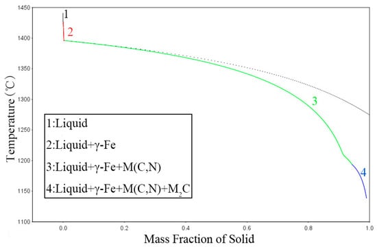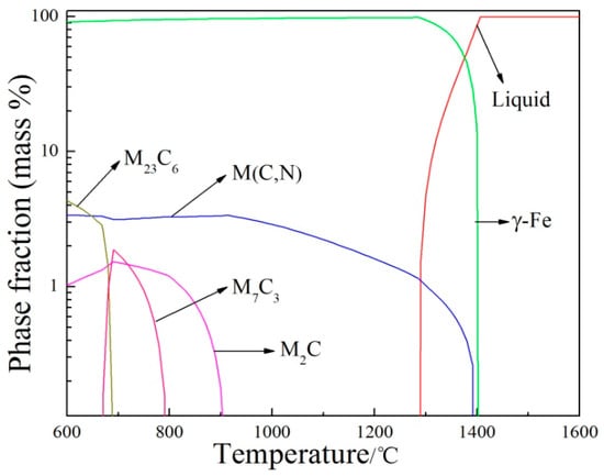 It can be seen from Figure 1 and Table 4 that M(C,N), M2C, M23C6, and M7C3 precipitate in sequence with the decrease of temperature. The precipitation temperature of M(C,N) is above 1300 °C. This indicates that M(C,N) is a highly stable phase and remains undissolved during heat treatment process.