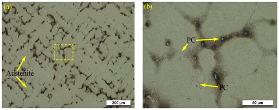 (a) Optical microscope (OM) images of as-cast electroslag remelting (ESR) ingot microstructure; (b) highly magnified images taken at the region marked by the yellow box in (a). PC represents primary carbides or carbonitrides.