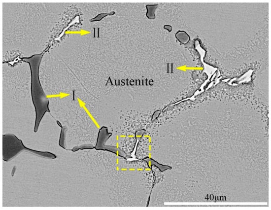 To predict phase precipitation during liquid steel solidification in a practical ESR refining process, the Scheil–Gulliver model included in Thermo-Calc software was employed to calculate the nonequilibrium phase precipitation in HMAS-N, as shown in Figure 2. M(C,N) precipitates from liquid steel directly. As the austenite continues to precipitate from liquid steel, carbon and alloying element contents keep increasing. Primary carbides M2C precipitate directly from liquid steel when the solid fraction of liquid steel exceeds 0.93. As shown in Figure 3a,b, partial primary carbides precipitate along preexisting austenite due to the composition of residual liquid steel reaching eutectic point. There are two types of precipitates (i.e., white- and gray-colored ones), which are represented by I and II, in as-cast ESR ingot as shown in Figure 4. The gray-colored and white-colored precipitates both distributed along grain boundaries. It can be seen in Figure 4 that some M(C,N) carbonitrides are mixed with M2C carbides on the grain boundary. This is because the M(C,N) phase precipitates at a higher temperature prior to the precipitation of the M2C phase.
