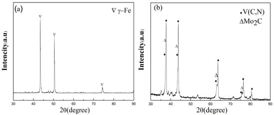 It can be confirmed from the microstructure in Figure 4 and the XRD results in Figure 6a that the matrix is a single austenite phase. Table 5 presents the EDS results of the carbides or carbonitrides shown in Figure 5. As shown in Table 5 and Figure 6b, M(C,N) (namely V(C,N)) contains a certain amount of the elements Cr and Mo. In addition, M2C is Mo2C, which contains more Cr and Mo atoms. As shown in Figure 5, the morphology of V(C,N) is an irregular multilateral strip or slice shape with severe angles. The morphology of Mo2C is rod-shaped or lamellar fish-skeleton-like, which is typical eutectic carbide according to eutectic reaction (L → γ + M2C).