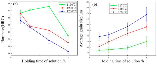 The hardness value of the specimens, which were subjected to various SSHT and the same aging treatment at 720 °C for 2 h, is shown in Figure 7a. The hardness value increased from 45.34 HRC to 47.24 HRC at a solution temperature of 1170 °C with increasing solution time from 0.5 h to 2 h. However, the hardness value decreased rapidly to 39 HRC when the solid solution time was 3 h at 1170 °C. When the solid solution temperature reached 1200 °C and 1230 °C, the hardness decreased linearly with the increase of solution holding time from 0.5 h to 3 h.