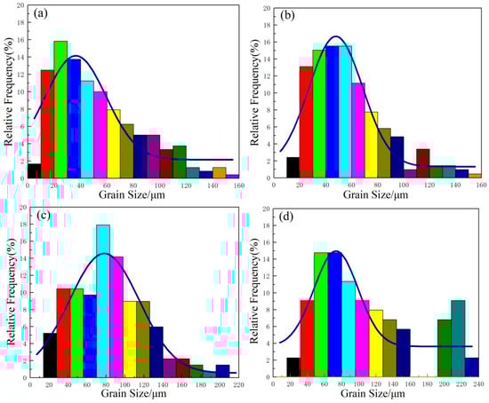 Grain-size distribution histograms obtained upon solution treatment at (a) 1170 °C for 0.5 h; (b) 1170 °C for 2 h; (c) 1200 °C for 2 h; and (d) 1230 °C for 3 h.