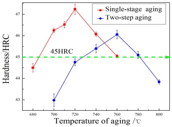 For single-stage aging and two-stage aging, Rockwell hardness shows a trend of first increasing and then decreasing with increasing aging temperature. In addition, hardness reach the maximum at 740 °C (47.24 HRC) and 760 °C (46.06 HRC), respectively, which is attributed to significant secondary hardening. Compared to single-stage aging, impact energy greatly improved despite the hardness decreasing by 1–2 HRC. In addition, the temperature for maximum hardness delayed.