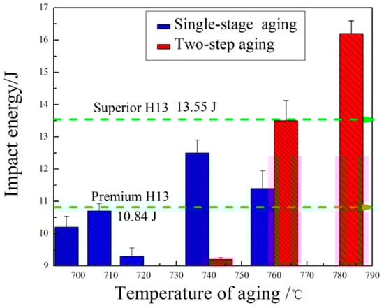 As for single-stage aging, experiments were carried out in a temperature range from 680 °C to 760 °C for 2 h, as shown in Table 2. The hardness improves gradually with aging temperature increasing from 680 °C to 720 °C, as shown in Figure 10. When the aging temperature was at 720 °C, significant secondary hardening occurred, and the hardness reached the maximum value of 47.24 HRC. It can be attributed to the enrichment and segregation of precipitate-forming elements at 720 °C, such as V, Mo, Cr, C, and N [8]. As the aging temperature continued to increase, the hardness decreased to 45.04 HRC at 760 °C. As for the two-stage aging, pre-aging and re-aging heat treatment experiments were carried out, shown in Table 3. The hardness increases with the re-aging temperature increasing from 700 °C to 760 °C. When the two-stage aging temperature was at 760 °C, the hardness reached the peak value of 46.06 HRC. As the re-aging temperature continued to increase, the hardness decreased and dropped to 43.84 HRC at 800 °C. Compared to single-stage aging, the hardness value of two-stage aging is slightly less than single-stage aging at the same aging temperature. In addition, the temperature for maximum hardness delayed. To ensure that the steel has higher hardness and impact toughness to restrain crack initiation and growth in the process of service, the Charpy impact tests were carried out for the specimens with Rockwell hardness values greater than 45 HRC after aging heat treatment. The impact energies after different aging heat treatments are shown in Figure 11. For single-aging at 720 °C, the hardness value reached the maximum value of 47.24 HRC, whereas the impact energy reached the minimum value at 9.2 J. The impact energy reached the maximum value of 12.5 J and the corresponding hardness value was 46.05 HRC at 740 °C. For two-stage aging, the impact energy gradually increased and reached the maximum value of 16.2 J at 780 °C with increasing temperature from 740 °C to 780 °C. As for two-stage aging heat treatment, impact energy greatly improved despite the hardness decreasing by 1–2 HRC compared with single-stage aging.