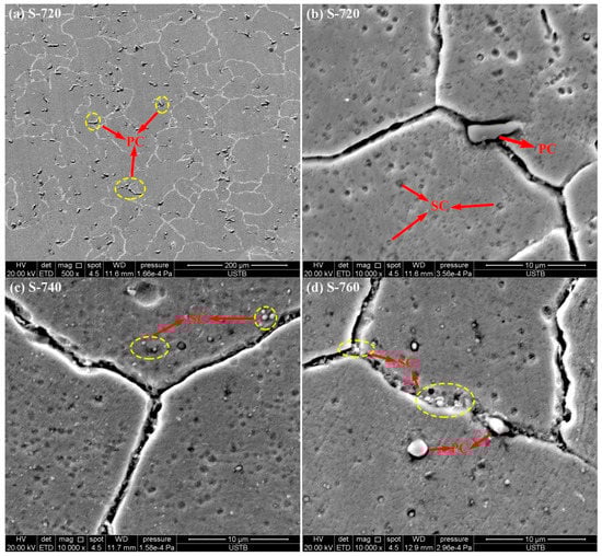 SEM microstructure of specimens after different aging heat treatment processes: (a,b) S-720, (c) S-740, (d) S-760. Note: PC represents primary precipitates. SC represents secondary precipitates.
