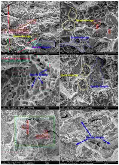 It is well known that structure and fractograph of a specimen are related to the mechanisms involved in the fracture process. The microstructure determines the performance of the steel. Figure 12a is a SEM micrograph of specimen S-720 at low magnification. It can be seen that there are massive, undissolved primary precipitates. Figure 12b–d are the scanning electron micrographs of specimens S-720, S-740, and S-760 at high magnification, respectively. When the aging temperature increased from 720 °C to 740 °C, the number of fine dispersed secondary carbonitrides increased, as shown in Figure 12b,c. As the aging temperature increased to 760 °C, the number of secondary carbonitrides decreased, but the secondary carbonitrides appeared to be aggregated, and the grain boundary was widened, as shown in Figure 12d. This is attributed to growth of large particles at the expense of small ones, resulting in the reduction in the total number of particles. Precipitation of carbides along the grain boundary will result in deterioration of toughness, which can be attributed to the decrease of grain boundary cohesion.