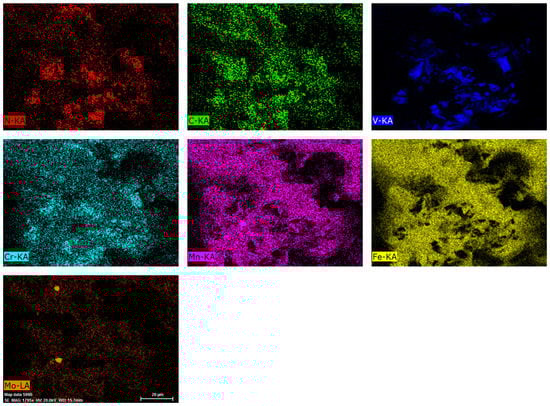 The SEM fractograph of specimens after the Charpy test for a fixed solid solution temperature (1170 °C) and various aging processes are shown in Figure 13a–f. Both quasi-cleavage facets and ductile dimples were observed, which indicated the mixed mechanism of fracture. The specimen S-720 showed mainly brittle-fractured surface zones characterized by transgranular quasi-cleavage and intergranular fracture (Figure 13a). It can be noticed that quasi-cleavage fracture facets encircled by ridges are much smaller than the austenite grain (58.4 μm), and this kind of morphology forms when a crack propagates along the primary precipitates. The size of intergranular fracture grains (~60 μm) was similar to the size of austenite grains (58.4 μm). This implies that intergranular fracture along the boundaries of austenite grains operated partially for specimen S-720. As shown in Figure 13b, quasi-cleavage facets show massive primary precipitates, which is consistent with the observation in Figure 11a. It indicated that quasi-cleavage nucleated along the precipitates. Some portions of the fracture surface exhibited ductile-fractured surface with fine dimples (Figure 13c). The dimple percentage increases with increasing aging temperature (from 720 °C to 760 °C) for single-stage aging treatment. The specimens S-740 and S-760 showed mainly ductile-fractured areas with fines dimples and some quasi-cleavage features (Figure 13d,e). It is clear that the fracture surface of specimen S-760 contained microcracks and some spherical secondary precipitates precipitated from the aging process, as shown in Figure 13e. The EDS results of the precipitates shown in Figure 13b,e are presented in Table 6. Figure 14 shows fractograph EDS element distribution mappings of specimen S-760. Figure 14 and the EDS results of point 1, shown in Figure 13b, indicate that elements N, V, C were enriched in the same area, confirming that undissolved coarse primary carbonitrides are V(C,N), which also contains a small amount of Cr. Figure 14 and the EDS results of point 2, shown in Figure 13e, indicate that spherical secondary carbides are Mo-rich carbides. Specimen T-780 presented more ductile dimples and fewer quasi-cleavage facets (Figure 13f).