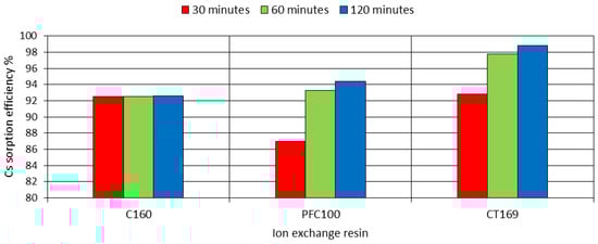 In the preliminary experiments concerning ion-exchange resin selection, it was found that all materials had above 65.0% efficiency of cesium ion sorption. The highest values were recorded for PFC100 and C160—above 90.0% cesium sorption. Results are presented in Table 1. CT169, C160, and PFC100 were selected for further investigations.