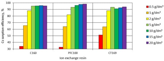 Cesium concentration in nitrate(V) solutions before sorption was in the range 0.5–20.0 g/dm3. It was found that, for CT169, efficiency of cesium ions was 99% when a solution of concentration 5.0 g/dm3 was used. Additionally, C160 and PFC100 had slightly lower cesium sorption efficiencies. For cesium concentration higher than 5.0 g/dm3, about 90% sorption efficiency was observed, regardless of the type of ion-exchange resin. The results are presented in Figure 2.