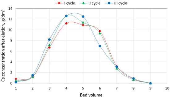 Sorption and elution tests of cesium ions allowed the determination of CT169 as the most appropriate resin for this purpose. Based on these results, optimum process parameters for dynamic tests were presented. Three operation cycles were performed using CT169. Results of cesium ion sorption are presented in Figure 5 and Table 5, while elution results are shown in Figure 6 and Table 6. High and stable sorption parameters, 75%–70% sorption efficiency and 4.5%–4.6% ion-exchange saturation, by cesium ions were obtained. Elution was very effective with an efficiency significantly above 95.0% in all cycles. It should be pointed out that a slight increase in the efficiency was observed in subsequent cycles, which indicates proper operation of the ion-exchange resin.