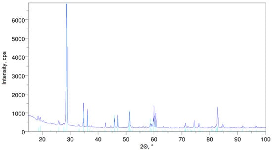 Results of crystallisation tests are presented in Table 7. It was found that over 80% efficiency of cesium perrhenate crystallisation may be achieved when cesium concentration in a solution is higher than 5.0 g/dm3 Cs. Impurity contents before and after purification are shown in Table 8 and Table 9, respectively. The proposed two-step crystal purification method—with 50 cm3 10% aq. H2O2 solution, followed by 20 cm3 acetone washing—allowed for obtaining nanocrystalline cesium perrhenate containing stoichiometric amounts of cesium and rhenium (i.e., 34.7% Cs and 48.6% Re and <2 ppm Bi; <3 ppm Zn; <2 ppm As; <10 ppm Ni; <3 ppm Mg; <5 ppm Cu; <2 ppm Na; <5 ppm Ca; <3 ppm Fe; <5 ppm Mo; <5 ppm Pb; <10 ppm K). XRD analysis of the crystals (Figure 7) proved that cesium perrhenate was prepared.