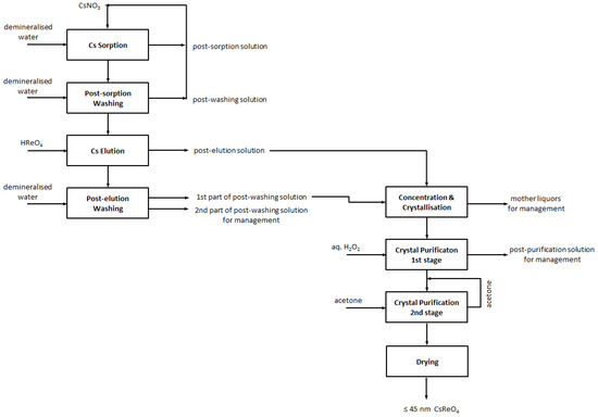 The developed method of anhydrous cesium perrhenate preparation is composed of eight technological blocks (Figure 8). Firstly, aqueous cesium nitrate solutions are directed to cesium sorption stage, where the solution is transferred through a CT169 ion-exchange resin bed placed inside an ion-exchange column. Sorption is performed down the columns at room temperature. The solution–bed contact time is up to 60 min. After the sorption stage the ion-exchange resin is washed using demineralised water, while post-sorption and post-washing solution streams are connected and directed to the initial solution preparation. The washed column containing the bed with sorbed cesium is eluted downward with aqueous perrhenic acid solution at room temperature, so the eluent–resin contact time is above 120 min. The eluate is collected as a single portion and directed to concentration and crystallisation, while the eluted bed is washed with demineralised water. The post-washing solutions obtained after elution are divided into two portions—the first one is connected with the solution directed to the concentration stage, while the second one, together with mother liquors and post-purification solutions, is directed to waste management. The solution obtained after the second part of elution, containing more than 5.0 g/dm3 Cs, is directed to concentration and crystallisation. The concentration stage is carried out at a temperature not exceeding 80 °C, preferably under vigorous stirring. Then, the solution is quenched and cesium perrhenate is crystallised. The crystals are filtered from a solution and washed with 10% aq. hydrogen peroxide solution and anhydrous acetone. Finally, the prepared cesium perrhenate crystals (≤45 nm) are dried at 120 °C until constant mass.