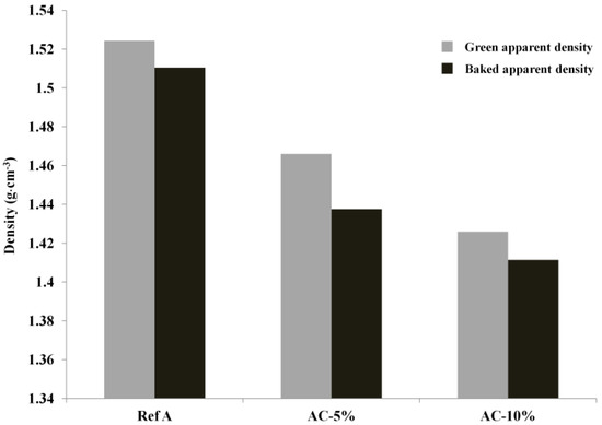 Figure 1 shows the apparent density of the green and baked anode samples containing different amounts of charcoal. Both green and baked apparent density decreased as the percentage of charcoal increased. This behavior could be due to the relatively low bulk density of charcoal. The bulk density of charcoal and calcined petroleum coke are 0.41 and 0.95 g·cm−3, respectively. In addition, as the charcoal has a relatively larger surface area (12 m2·g−1) than that of calcined coke (5 m2·g−1), the amount of pitch was probably not optimum to cover all of the fine particles, affecting the viscosity of the binder matrix and its compaction behavior.