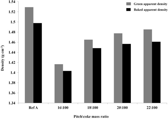 Figure 3 shows green and baked apparent densities of anodes containing 10% charcoal but different pitch/coke mass ratios. For comparison, the density of the reference anode is presented in the same figure. By increasing the pitch/coke ratio by 2/100 (i.e., from 16 to 18/100), a pronounced increase in the anode density was achieved. Gradual improvement in the green apparent density was noticed by a further increase in the pitch content, which means that the density approaches a value asymptotically. As expected, this behavior can be attributed to the availability of more pitch for better coverage of the fine particles, providing a suitable binder matrix for compaction. The apparent density of the baked anodes achieves a maximum value by increasing the pitch/coke ratio, and further pitch addition leads to an increased baking loss that reduces the baked density [9,11]. Although the negative effect of charcoal on the green and baked density is greatly mitigated by increasing the pitch content, the apparent densities of the anodes containing charcoal are still lower than that of the reference anode. In the best case (22/100 pitch/coke ratio), the density of the baked sample is 3% lower than that of the reference sample. This could be attributed to the low density (high porosity) of charcoal itself compared to that of calcined coke. The pore size of the charcoal is most likely too small to be totally filled with pitch during mixing.