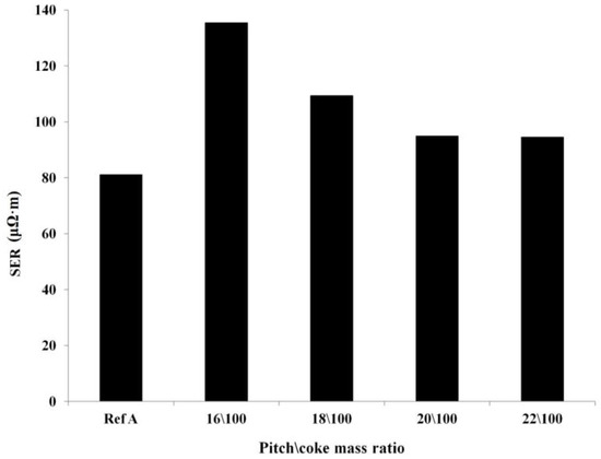 Figure 4 shows the effect of pitch content on the specific electrical resistivity (SER) of the anodes containing 10% charcoal. As the density of the anode was improved by increasing the pitch content, the specific electrical resistivity was reduced. These results suggest the influence of the anode baked apparent density on its SER. The SER of the anodes experienced reduction by 26.1 μΩ·m as the pitch/coke ratio was increased from 16 to 18/100. Further pitch addition up to 22/100 led to a slight reduction in SER. As the baked anode density approaches a maximum value when pitch content is increased, so does the electrical resistivity. It decreases rapidly at first and then at a much lower rate.