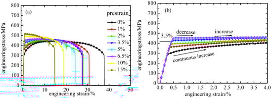 Engineering stress–strain curves of different prestrained specimens. (a) 0%–15% prestrained CP-Ti and (b) the appearance of yield plateau.