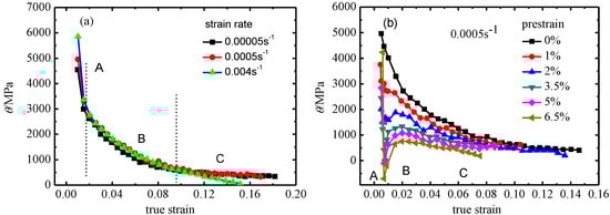 The variation of work hardening rate with true strain. (a) As-received CP-Ti at different strain rates and (b) prestrained CP-Ti at 0.0005 s−1.