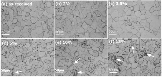 Metallographic figures of different prestrained samples: (a) as-received; (b) 2%; (c) 3.5%; (d) 5%; (e) 10% and (f) 15% prestrained specimens. Twins are indicated by white arrows in Figure 5d–f.
