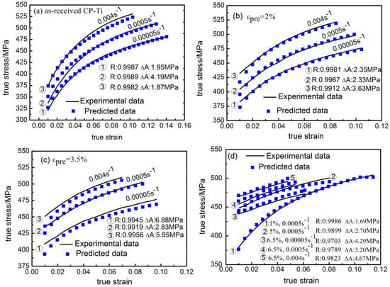 Comparison between the experimental and predicted flow stress data from the modified Fields-Backofen model: (a) as-received CP-Ti; (b) 2% prestrained CP-Ti; (c) 3.5% prestrained CP-Ti; (d) 1%, 5%, 6.5% prestrained CP-Ti.