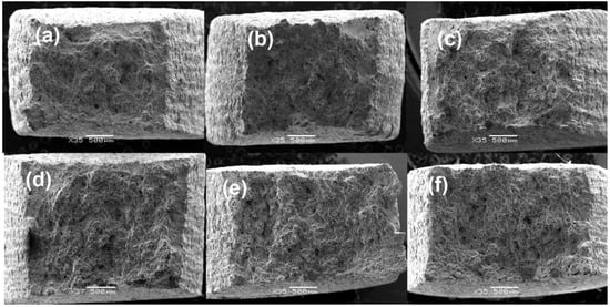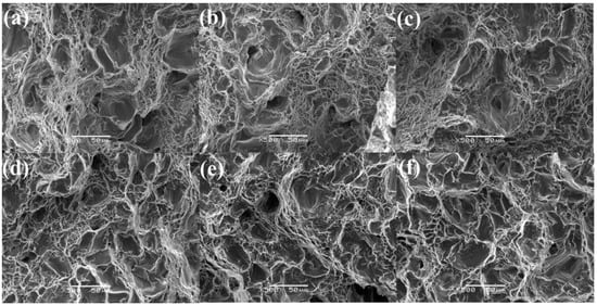 Micrographs of fractured surfaces of prestrained CP-Ti: (a) 1% prestrained; (b) 3.5% prestrained; (c) 6.5% prestrained; (d) 1% prestrained with annealing; (e) 3.5% prestrained with annealing; (f) 6.5% prestrained with annealing.