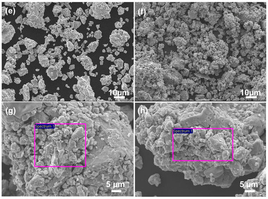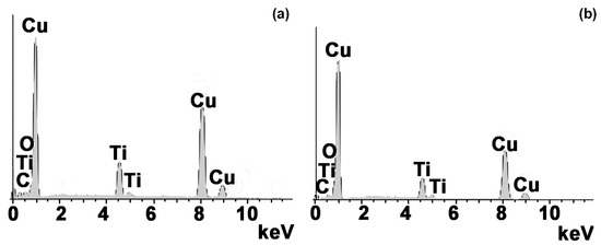 Figure 1a,b shows SEM images of starting powders, respectively for TiH2 and copper powders. TiH2 particles have an irregular shape while Cu powder particles have a dendritic shape. Figure 1c–f show SEM images of composite powders formed after 10 h of milling of Cu–TiH2–C and Cu–Ti–C mixtures, with different amounts of reinforcement particle content. As one can observe, the increase of the reinforcement particle content the particle size of milled powders decreases for both composites. Cu–Ti–C composite presented finer particles than those for the Cu–TiH2–C composite, with the same reinforcement particle content. As can be seen from SEM images shown in Figure 1g,h. Some large particles were formed due to agglomeration of small particles reaching a size of 10–30 µm. EDS analyses (Figure 2) were performed on particles such as in Figure 1g,h which presents spectra relative to such analyses, of which it is worth noting that there was no contamination of Fe either from the milling tools (Table 1). However, such contamination was already observed even in the ex-situ method as reported in [16].