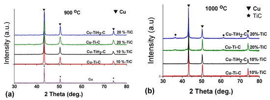 Relative density measurements, presented in Table 3, confirm the above results regarding porosity. The relative density of the Cu–TiH2–C and Cu–Ti–C nanocomposites increases as the sintering temperature increases from 900 to 1000 °C. Therefore, one could infer that this fact may be due to the enhanced viscosity of Cu/Cu(Ti, C) matrix at the higher sintering temperature, which results in an efficient filling of pores due to high diffusion rates. In composites produced in-situ, the interfacial area is higher compared to ex-situ composites, detrimental effects of interfacial phenomena (decohesion, void formation) are more likely to prevail at high sintering temperatures compared to low sintering temperatures. Islak et al. [7] reported that in hot-pressed Cu–Ti–C nanocomposites, with 10 vol % TiC, the highest relative density obtained was about 86.4%, while in our samples, with the same TiC content, it is, on average, around 96.8 either for Cu–TiH2–C or Cu–Ti–C nanocomposites sintered at 1000 °C. The presence of porosity on the surface of nanocomposites is a natural result of the consolidation process. The relative density of Cu–TiH2–C has higher than that of Cu–Ti–C composite that why the amount of porosity can be seen in Figure 4b,d is more than in Figure 4a,c, respectively. The maximum relative density values were measured for Cu–TiH2–C and Cu–Ti–C nanocomposites at the sintering temperature of 1000 °C with 10 vol % TiC, which were 97% and 96.6%, respectively.