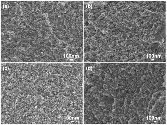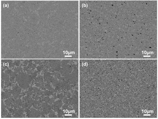 SEM images of Cu–TiH2–C and Cu–Ti–C nanocomposites Spark Plasma Sintered at 1000 °C: (a) 10 vol % TiC, Cu–TiH2–C nanocomposite; (b) 10 vol % TiC, Cu–Ti–C nanocomposite; (c) 20 vol % TiC, Cu–TiH2–C nanocomposite; (d) 20 vol % TiC, Cu–Ti–C nanocomposite.