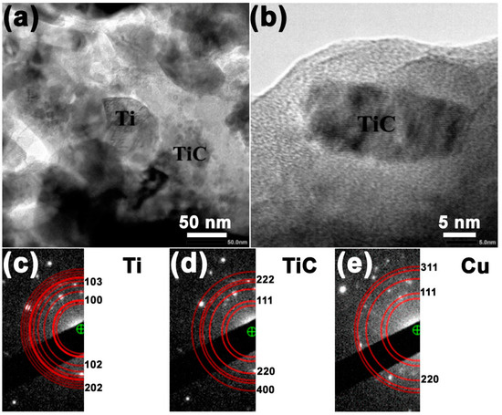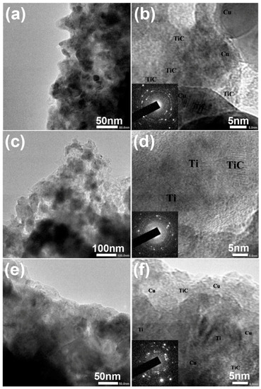 Figure 6c,d present TEM images of Cu–Ti–C nanocomposites, with 10 vol % TiC, and sintered at 900 °C, showing few TiC nanoparticles with sizes ranging between 10 to 30 nm. As it occurred for Cu–TiH2–C nanocomposites, at the low sintering temperature of 900 °C, only a small fraction of Ti will react with C, and most of Ti and C continue dissolving in the composite matrix. At the sintering temperature of 1000 °C (Figure 6e,f), more TiC precipitates, whose particle size ranges from 10 to 20 nm. Nevertheless, Ti is still observed in the HRTEM image presented in Figure 6f.