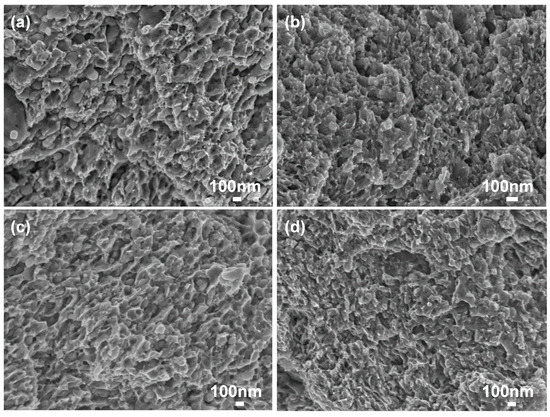 Fracture surfaces of 10 vol. %TiC (a) Cu–TiH2–C nanocomposite sintered at 900 °C; (b) Cu–Ti–C nanocomposite sintered at 900 °C; (c) Cu–TiH2–C nanocomposite sintered at 1000 °C; and (d) Cu–Ti–C nanocomposite sintered at 1000 °C.