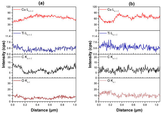 In order to investigate the distribution of reinforcing particulates in copper matrix, EDS analyses for the composite sintered at 1000 °C with 10 vol % TiC, is presented in Figure 9. The size of the “waves” on the Ti and C concentration profiles along the x-axis (distance) corresponds well to the size of the TiC nanoparticles introduced into the copper matrix through ball milling. The distribution of the Ti and C through copper matrix in Cu–TiH2–C is better than of Cu–Ti–C. The content of oxygen in Cu–TiH2–C is lower than Cu–Ti–C composite which means that the effect of hydrogen release from TiH2 reacts with the oxygen lead to reduce the oxygen content in the composite after sintering. No contamination such as Fe from the balls and jar can be detected for both composites.