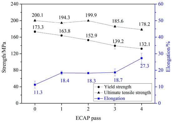 - The grain size of as-extruded materials (~10.9 μm) is refined significantly by 1-pass ECAP (~5.8 μm), and resulted in a remarkably enhanced elongation to failure (EL) (~+62%) with a slightly decreased strength (~−3%) comparing to the as-extruded condition (EL = ~11.3%, UTS = ~200 MPa). The EL is further increased to ~27.3% (~+142%) after 4-pass ECAP compared to the as-extruded condition, which is mainly due to the much more homogenized microstructure. The split basal poles with about 60° rotations to the extruded direction (ED) and the relatively coarsened grain size by SRX and post-DRX after 4-pass ECAP might be responsible for the decreased strength with increasing ECAP pass.