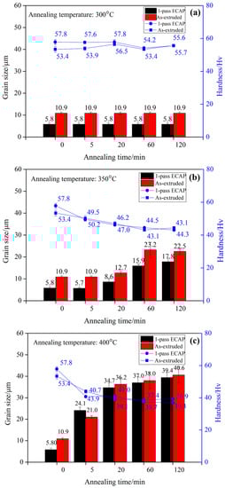 - Annealing treatments indicate that recovery dominantly occurs at 300 °C, SRX and grain growth emerge at 350 °C and 400 °C, respectively. Meanwhile, the grain growth and hardness decrease rapidly even within 5 min for 1-pass ECAPed alloy at annealing temperature 400 °C, implying a larger grain boundary mobility induced by higher deformation energy than the as-extruded ones.
