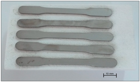 Weighed powders were mixed for 1 h without ball with a Turbula brand and three-axis mixer (Willy A. Bachofen AG, Muttenz, Switzerland). This mixture powders were unidirectionally pressed at 700 MPa in the form of tensile sample with 96 ton pressure capacity Hidroliksan brand device (Hidroliksan, Konya, Turkey) at room temperature. As can be seen in Figure 2, tensile samples were prepared according to the standards of ASTM (E8M) powder metal material.