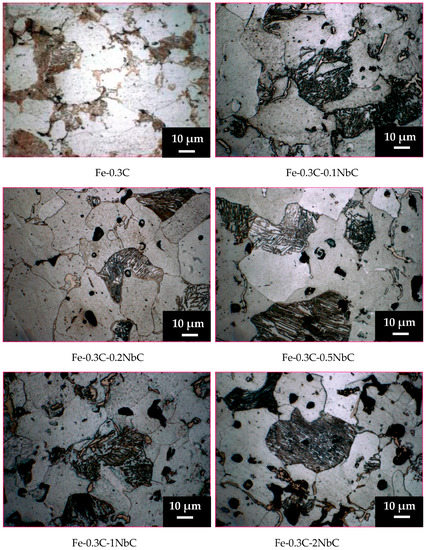 One of the most significant specifications of the alloy elements is that they prevent the grain growth by generating carbide and nitride during the austenitizing or sintering processes. The fact that small precipitates occur during austenitizing prevent austenite grain growth and lead to development of small ferrite grains in the course of cooling [20,21,22]. It was observed that the average grain size increased slightly with the NbC ratio increasing from 0.2% to 2% by weight. The fact that large NbC precipitates occur at the grain boundary can be considered as a reason for this increase [11,12]. Accumulation of large precipitates cannot prevent grain growth sufficiently.