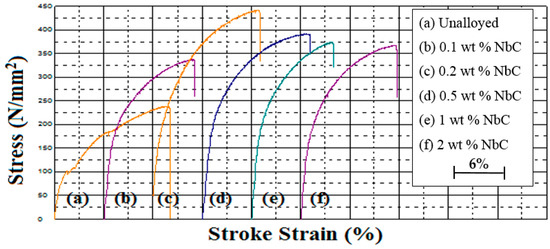Variation of stress–strain curves of the unalloyed PM steel and alloyed PM steels with different NbC contents sintered at 1400 °C for 1 h.