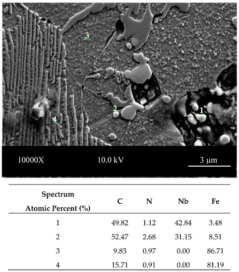 The effect of the alloy elements in the solid solution on the re-crystallisation of austenite is very weak. The inhibition of the grain boundary movement by precipitated particles is much more effective than dissolved atoms [27]. Microstructure, SEM, and EDS analysis indicated that Nb is in the solution and in the form of precipitate particles.