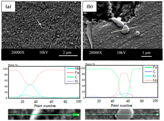 Moreover, Figure 6 shows the results of the EDS line analysis from matrix and precipitates of the PM steels containing 0.2% NbC and 2% NbC by weight, which is sintered at 1400 °C. When the EDS line results of 0.2 and 2 wt % NbC-added steel were examined, there seems to be a difference between the type and amount of the element throughout the line which cuts the matrix and the precipitate. It is observed that the matrix phase is rich in iron, but the precipitate is rich in Nb.
