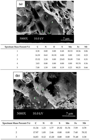 SEM image and EDS point analysis of the PM steels which have 2% NbC by weight can be seen in Figure 5. SEM image of PM steels with 2% NbC by weight indicated the presence of precipitates with different sizes. Additionally, results of the EDS point analysis show that these precipitates are NbC, because they contain Nb and carbon elements. SEM and EDS analysis also showed the presence of NbC(N) precipitates in steel. These precipitates prevented austenite grain growth and re-crystallisation and increased the hardness of the PM steels with precipitation hardening [26].