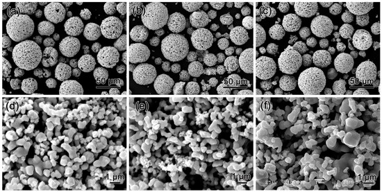 SEM images of conventional and multimodal mixtures of the agglomerated spherical powders produced by spray dry and conversion: (a,d) sample A1; (b,e) sample A2; (c,f) sample A3.