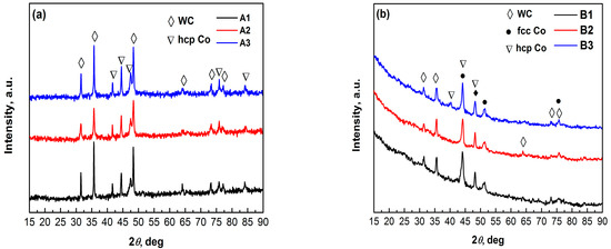 In addition, the X-ray powder diffraction patterns of the spray powders, as shown in Figure 2a, exhibit sharp and intense features, indicating their highly crystalline nature. Moreover, the Co phase in the spray powders exhibits a hexagonal structure as the three peaks appear at 41.7°, 44.2° and 47.6°, corresponding to (100), (002) and (101) of hcp-Co (ICSD 05-0727), respectively. However, the diffraction patterns of the sprayed coatings exhibit broaden peaks, indicating the presence of non-crystalline phases. This can be attributed to the fact that the particles can reach quite high temperatures during the HVOF process, while they did not have enough time to crystallize under a high cooling rate [8]. Moreover, a portion of the Co phase was transformed into face-centered cubic structure by polymorphic transformation during the HVOF, as shown in Figure 2b, which would be beneficial to the adhesion strength to the substrate due to the good ductility of the face-centered cubic Co phase.