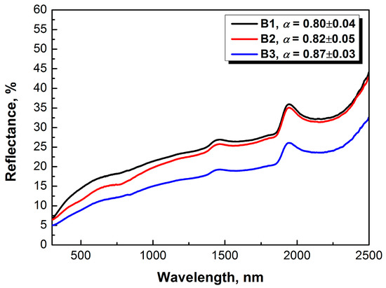 Figure 3 shows the reflectance curves in 0.3–2.5 μm for the conventional and multimodal coatings together with the calculated absorptance. The multimodal absorbing coating (B3) exhibited a relatively high absorptance of 0.866, which was higher than the conventional coatings with values of 0.803 (B1) and 0.825 (B2), respectively. As the nano-sized WC can offer significant potential as a material showing enhanced or tunable light harnessing [19,20,21,22], thus the absorptance of sample B2 was measured to be higher than that of sample B1. The enhancement in solar absorptance in the multimodal (B3) coating over the conventional (B1 and B2) coatings will be discussed in Section 4.