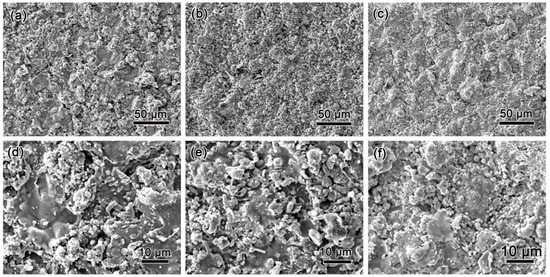 SEM micrographs of the conventional and multimodal coatings produced by HVOF: (a,c) sample B1; (b,e) sample B2; (c,f) sample B3.