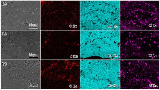 In addition, the multimodal coating exhibited a more uniform element distributions combined with the coarse and fine WC particles, as illustrated in Figure 7. The formation of multimodal WC particles in the multimodal coating can be directly related to the following three factors: The formation of multimodal WC particles in the multimodal coating can be directly related to the melting behaviors of coarse and fine WC particles. The nanometer WC particles have lower softening and melting temperatures than the sub-micrometer WC particles, due to the larger surface area to volume ratio. Thus, the fine WC particles were sufficiently melted during HVOF and distributed uniformly among the grain boundaries of Co grains, while the coarse WC particles distributed unevenly due to their insufficient melting. In addition, the momentum of coarse WC particles was larger than that of fine WC particles. The coarse and fine WC particles cannot reach the substrate simultaneously, which would lead to a difference in deformation degree. Thus, the coarse WC particles exhibited a flat shape, as shown in Figure 5f.