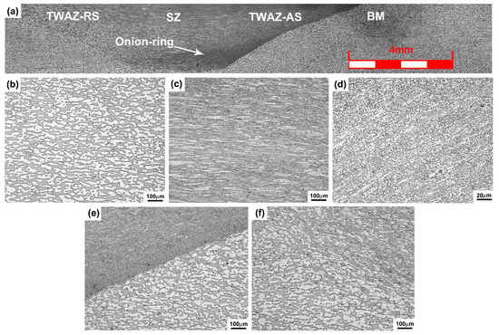 Optical microscopy of cross section of the joint (a); related microstructure (b) base metal (BM); (c) stir zone (SZ); (d) stir zone—advancing side (SZ-AS); (e) thermo-mechanically affected zone—advancing side (TMAZ-AS); (f) thermo-mechanically affected zone—retreating side (TMAZ-RS).
