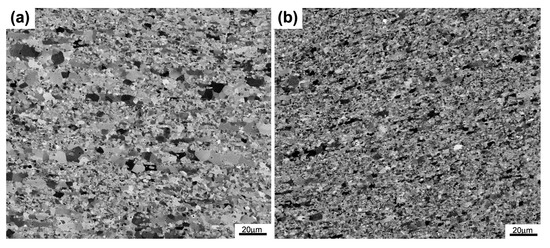 In the SZ, grain size in the austenite and ferrite phases slightly differ; that is, the austenite phase is slightly more pronounced than the ferrite phase. The grain size of DRX is known to be associated with the deformation and diffusion rate of atoms. During FSW, deformation mainly occurs in the ferrite phase because it is considerably weak at high temperatures. Fang et al. have demonstrated that, during the hot deformation of a new DSS containing high nitrogen content, the wedge crack is nucleated at the interface between the ferrite and austenite phases and easily propagates toward the ferrite phase; hence, the ferrite phase is softer than the austenite phase at high temperatures [28]. Consequently, great strain occurs in the ferrite phase and supplies additional energy for nucleation. Moreover, the ferrite phase has a higher diffusion rate of atoms compared with the austenite phase at high temperatures [28]. Both of them can produce a recrystallization process, which is followed by grain growth in the ferrite phase. According to earlier studies, DRX, including continuous DRX (CDRX), or discontinuous DRX (DDRX) may exist in the SZ during the FSW of DSSs [24,25,26,29,30]. High stacking fault energy (SFE) of the ferrite phase facilitates CDRX. By contrast, low SFE of the austenite phase facilitates DDRX.