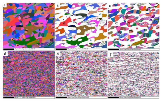 EBSD maps of the BM and the SZ: (a) map for the BM; (b) ferrite of the BM; (c) austenite of the BM; (d) map for the SZ; (e) ferrite of the SZ; (f) austenite of the SZ.