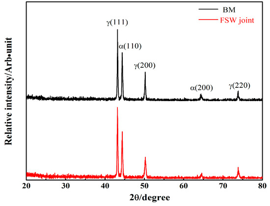 During solid-state transition, austenite formation in the fusion zone of DSSs depends on cooling rate. Followed by a fully ferrite phase, nucleation of the austenite phase preferentially lies in the grain boundaries of the ferrite grains during the weld cooling cycle. Previous evidence demonstrates that using high-heat inputs and slow cooling rates during the GTA process produce microstructures containing considerable amounts of various forms of the austenite phase, such as grain boundary austenite and secondary austenite [33]. In the present study, microstructural characterization shows that the intergranular austenite phase is absent in all regions across the weld. In addition, these regions contained a microstructure consisting of a ferrite matrix with austenite islands. As shown in Figure 7, the XRD spectra of the BM and the SZ consist of ferrite and austenite phases. The intensities of the α phase diffraction peak (110) and γ phase diffraction peak (111) in the SZ and the BM are nearly equal, implying that the ratio of the ferrite/austenite phase of the SZ is close to that of the BM. Overall, the ratio of the ferrite/austenite phase in the SZ is similar to that in the BM, as revealed by related studies [18,24]. The similarity of the ratios of the ferrite/austenite phase between SZ and BM indicates that the peak temperature is below the transition temperature between austenite and ferrite during FSW of DSSs.
