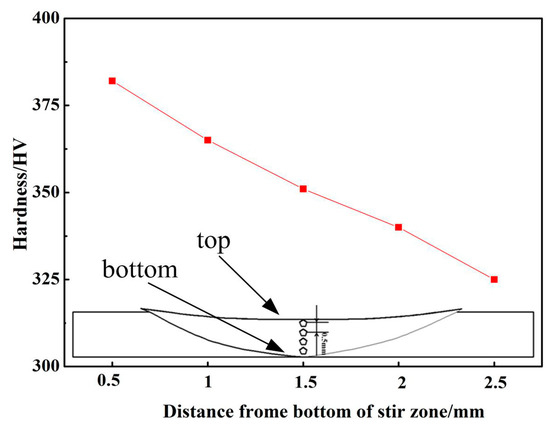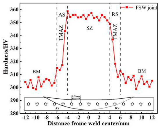 Figure 8 shows the hardness values, as a function of the distance from the weld center, across the joint. The maximum hardness with minimal fluctuation lies in the SZ. Compared with the BM, the SZ shows a smaller fluctuation. BMs contain large grains, and the hardness of its ferrite and austenite phases differs. Thus, fluctuation in the BM is greater than that of the SZ. As the distance from the SZ increases, the hardness values gradually decrease. The difference in hardness between the BM to the TMAZ ranges from 303 HV to 355 HV. The main mechanism of this remarkable welding technique involves fine grains occurring in the SZ as a result of DRX without changes in proper phase balance. Moreover, as indicated by the microstructure of the SZ, the σ phase precipitation has not occurred. Hence, as explained by Hajian [34], the dominant mode toward an increase in hardness in the SZ is related to grain refinement, according to the fine-grain strengthening theory. Similarly, the values of hardness gradually decrease from the bottom to the surface of the weld joint (shown in Figure 9).
