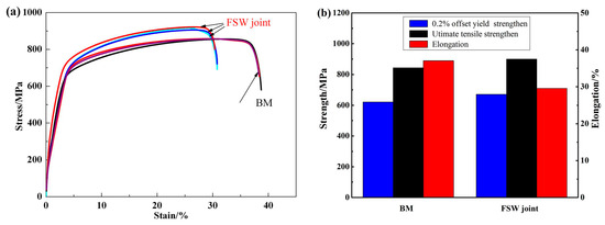 (a) Stress–strain curves of the BM and FSW joint; and (b) results of tensile test.