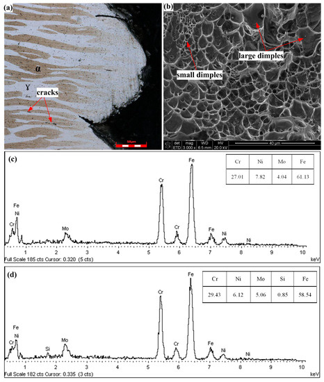 Figure 12a,b shows the optical micrograph of the tensile surface and SEM morphology of the weldment fracture surface. The phase appearing reddish brown in the OM is the ferrite phase (α) and the phase appearing white is the austenite phase (γ). The typical EDX results of dual phases are shown in Figure 12c,d, respectively. Crack initiation apparently occurred in the interface of the ferrite and austenite phases. The cracks propagated toward the austenite phase, which is softer than the ferrite phase at room temperature as a result of the low SFE. The SEM morphology of the weldment fracture surface is characterized by a dimple with a microvoid, a feature of a ductile fracture. However, size distribution of the dimple is inhomogeneous, which corresponds to low elongation [35].